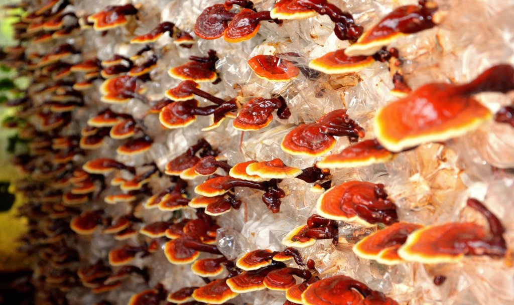 - au reishi (ou Ganoderme) qui est volontiers appelé le "champignon de l'immortalité". Ce champignon est comestible. Il stimule l'immunité, a des propriétés anti-inflammatoires et peut aider à réguler le taux de sucre dans le sang. (gélules de Ganoderma au labo La Royale)